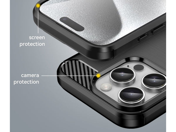 Das ultraleichte Fallschutz Cover mit Carbon Optik in schwarz schützt dein Apple iPhone 16 Pro Max effektiv vor Beschädigungen im Alltag. Effektiv gegen Stürze oder Stösse welche unschöne Kratzer und Dellen an deinem Handy hinterlassen.