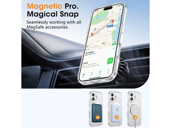 Das Apple iPhone 17 MagSafe Case verfügt über eine gehärtete Rückseite aus Polycarbonat mit eingebautem Magnetring. Laden Sie Ihr Apple iPhone 17 bequem mit Ihrem MagSafe Charger auf, ohne die Hülle entfernen zu müssen. Der Magnetring ist mit 38 Magneten versehen, um einen stabilen Halt für Ihr MagSafe Zubehör wie MagSafe Ladegerät, externe MagSafe Batterie, MagSafe kompatible Halterungen oder MagSafe Leder Wallet zu gewährleisten.