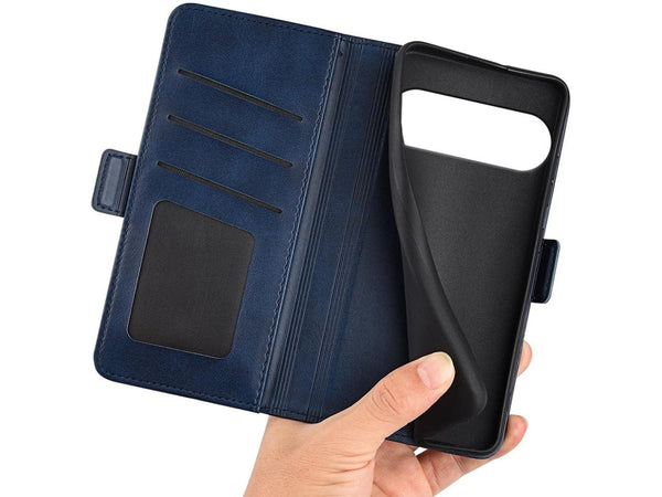 Mit der aus veganem Leder hergestellten, aufklappbaren 3-in-1 Ledertasche in dunkelblau hast du alle wichtigen Dinge dabei. Das langlebige Smartphone Leder Cover bietet nicht nur einen idealen 360 Grad Rundumschutz für dein Google Pixel 10, es bietet zusätzlichen Platz für deine Bankkarten, Kreditkarten, Visitenkarten, Bargeld sowie einem Fach mit Sichtfenster für einen Ausweis oder Mitgliedskarten. Dadurch musst du deine ID Karte oder Ausweis Badge nicht mehr herausnehmen, da diese Karte mit geöffneter Hülle sichtbar ist.