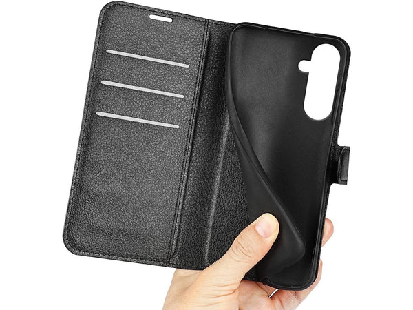 Das griffige Litchi Leder Etui ist langlebig und bietet eine angenehme Haptik, damit dir das Handy nicht aus der Hand rutscht. Das aufklappbare Design schützt zudem auch dein Samsung Galaxy A17 5G Handy Display.