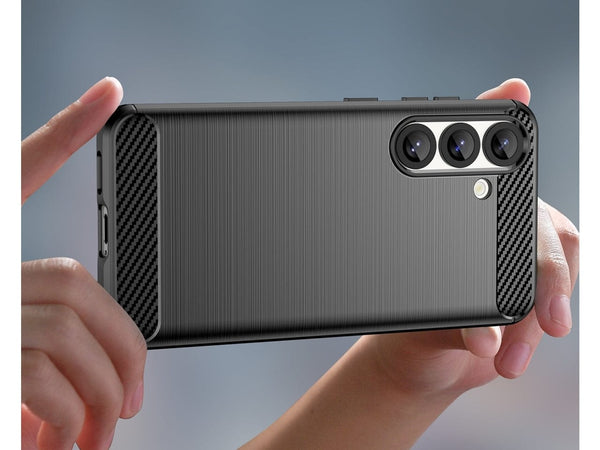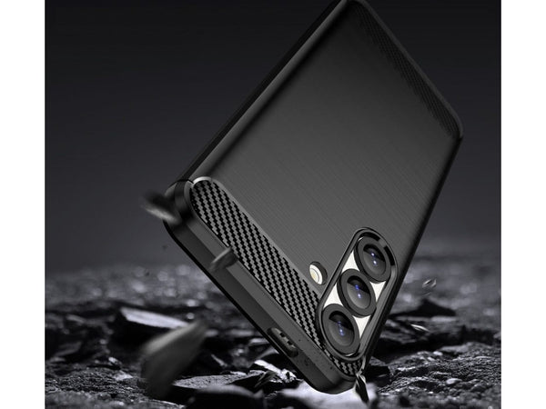 Das ultraleichte Fallschutz Cover mit Carbon Optik in schwarz schützt dein Samsung Galaxy S25 FE effektiv vor Beschädigungen im Alltag. Effektiv gegen Stürze oder Stösse welche unschöne Kratzer und Dellen an deinem Handy hinterlassen.