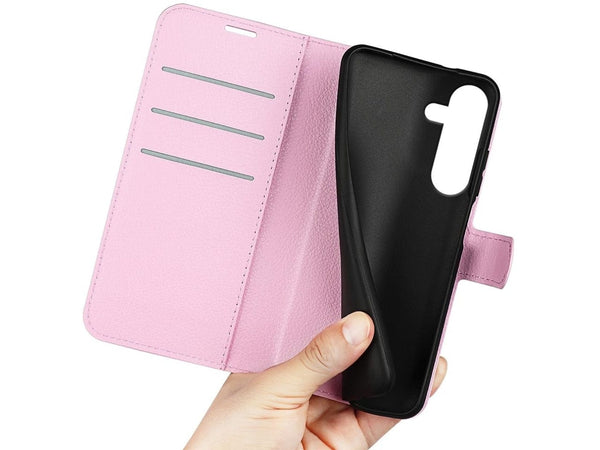 Das griffige Litchi Leder Etui ist langlebig und bietet eine angenehme Haptik, damit dir das Handy nicht aus der Hand rutscht. Das aufklappbare Design schützt zudem auch dein Samsung Galaxy S25 FE Handy Display.