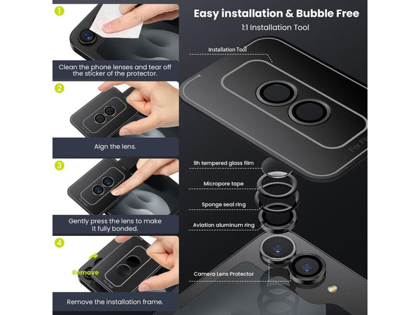 Die Schutzgläser sind exakt auf die Kamera Ihres Samsung Galaxy Z Flip6 zugeschnitten. Eine hochwertige Silikonschicht sorgt dafür, dass sie sich automatisch blasenfrei an die Linsen anlegen und sicher haften – ganz ohne komplizierte Montage. Mit dem mitgelieferten Ausrichtungsrahmen gelingt die Installation besonders einfach, und die Gläser lassen sich jederzeit rückstandslos wieder entfernen.