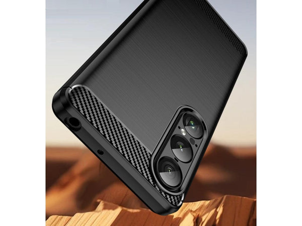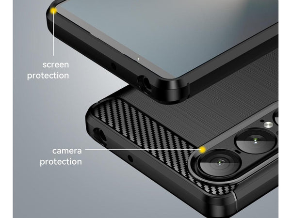 Das ultraleichte Fallschutz Cover mit Carbon Optik in schwarz schützt dein Sony Xperia 1 VII effektiv vor Beschädigungen im Alltag. Effektiv gegen Stürze oder Stösse welche unschöne Kratzer und Dellen an deinem Handy hinterlassen.