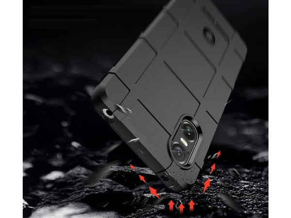 Extra starker Schutz für dein Sony Xperia 10 VI mit der Schutzhülle aus der Rugged Shield Series. Das stossfeste TPU Schutz Case in schwarz bewahrt dein Smartphone vor Schäden bei hartem Aufschlag auf dem Boden.